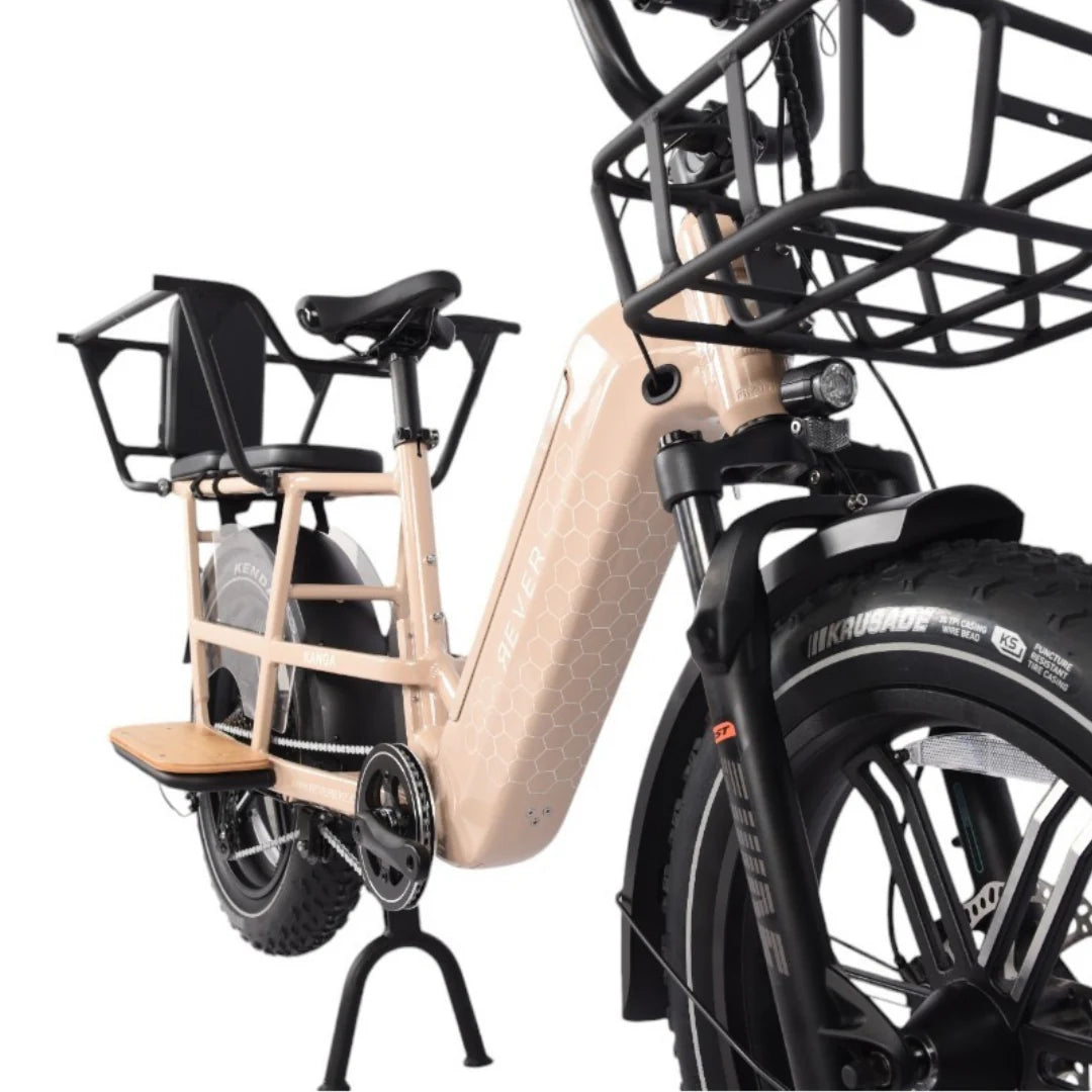 The 20×4″ Kenda tyres and aluminium frame balance comfort, strength, and retro style. Tektro hydraulic disc brakes ensure reliable stopping power, and the ATP 800S display keeps you informed with real-time ride data. Whether cruising through the suburbs or setting off on weekend adventures, the REVER Kanga Cargo offers a stable, enjoyable, and family-friendly ride.